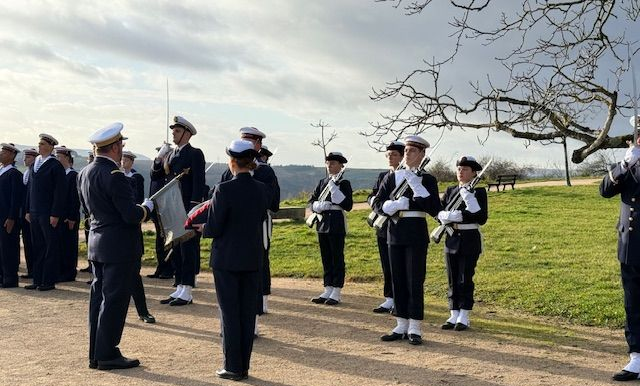 Cérémonie de remise de fanion de la 5è promotion (cycle 2020-2021) de la PMM Gaspard Monge de Beaune, sous l'autorité du capitaine de vaisseau Gauthier DUPIRE (commandant le bâtiment d'essais et de mesures Monge) et de l'enseigne de vaisseau de 2è classe (R) Hugo CHARRIER (chef de centre de la PMM Gaspard Monge de Beaune).